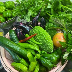 今日の収穫、きれいだなー。 右のハンダマの葉、冬地下茎をたもつの成功して今年も元気。沖縄の野菜?料理法がイマイチで、誰か教えて欲しいです。 沖縄の方はどう食べてるのでしょう。