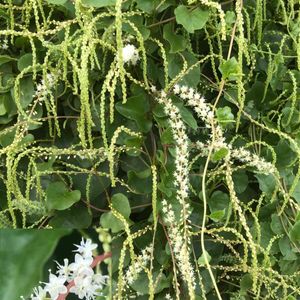 オカワカメ 別名 アカザカズラ(藜蔓) ウンナンヒャクヤク(雲南百薬) ツルムラサキ科 オカワカメという野菜をご存じですか⁉️ 茹でた葉はちょっとぬめりが出て➿➿ワカメにそっくりな食感になります😋😋😋 オカワカメは様々なお料理に使えてとても便利です💚 更に 葉酸やミネラル(カルシウム、マグネシウム、亜鉛、銅)ビタミンAを多く含み栄養価が高いことから💪健康野菜として注目されています🤗 更に更に ツルは3m以上に長く伸び 光沢のある厚い葉は夏の高温に強く🌞緑のカーテンになり💚💚 太陽の光に反射して✨輝きます✨ 秋の今頃は ほのかな香りのある白〜クリーム色のかわいい小花が穂状につきます🤍 皆さんも来年はぜひ栽培してみて下さいね❣️