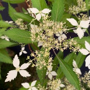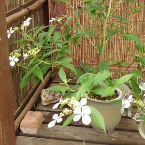 ヤクシマコンテリギ(アジサイ) 昨年お迎えして、1年経過😊 成長が遅いのでしょうか、でも 弱くはなさそうです。 この儚げな風情、好きですねぇ〜♡︎ᵎᵎᵎ♡̷︎♡⃜︎♡⃡︎
