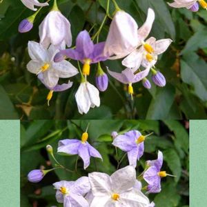 白や紫、青のツルハナナスの花、 始めは蕾と同じ紫色に咲き、咲き進むと白くなるそうです。 ニオイバンマツリの花と同じですね。 はちなつめさん、ミルクティーさんに教えて頂きました! 暑さの中でもとても長い間咲いて綺麗です💕