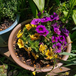 サントリー、サフィニアパープルミニ🌺ミリオンベルイエロー🌼 どちらも30度でもへこたれない!すっごいモリモリ‼️🥰