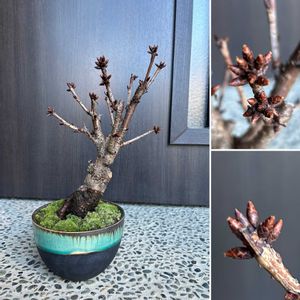 新年初回の盆栽教室 ・旭山桜🌸 枯らしてしまったので新しい子を迎えました 双枝でなく単体でチャレンジです 鉢も新しくして今度こそ まだまだ固い蕾ですが 花開くのがほんとに待ち遠しいです ・五葉松 ボサボサだったのでかなり葉っぱをむしりました ワイヤーをかけて整形 五葉松にはいろんな種類があるのですね 私のは葉が短めのものだけど 長めのにもチャレンジしてみたいです (けど今は五葉松は少なくて入手困難で高価とのこと) マツヤニで真っ黒になった指先に 妙な満足感を感じます😁