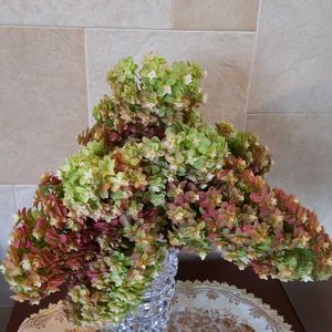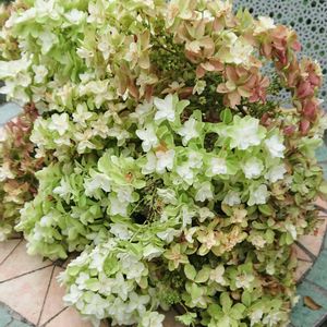 先程のpic ❀*.゚Nガーデンの向こう側のガーデンテーブルの上 八重咲き カシワバアジサイが乗っていましたね💮🌿😊💕 今日は庭仕事4時間頑張りました💪 雨続きで小道が通れなくなり不便なので背丈の有る オカノトラノオ、モナルダ、ヘレニウム、シレネ、 八重咲き カシワバアジサイを剪定 明日は雨予報なので階段の吹き抜けにカシワバアジサイを吊して ドライフラワーの準備、そして断捨離の続きをします🙌 カシワバアジサイほんのり赤くなってきたので株の手前から✂️ して半分少し越えた所まで剪定終わりました あとは外側から回って✂️雨じゃ無い日にやる予定です