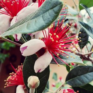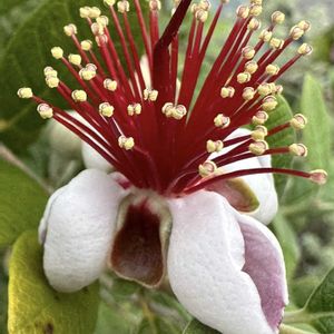 夏に径4cmほどの花をつける。 花弁は内側が赤褐色 外側が白色で分厚く 多数ある赤い雄蕊が目立つ🎶 フェイジョア フトモモ科