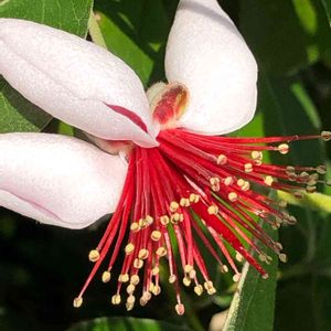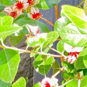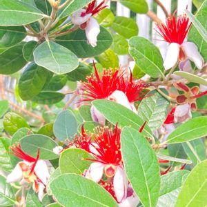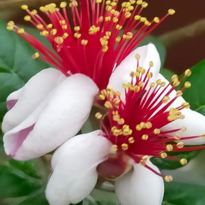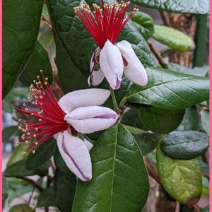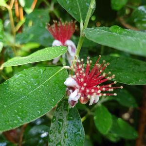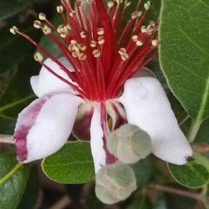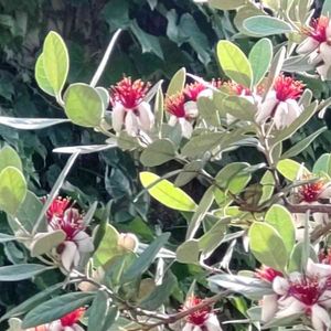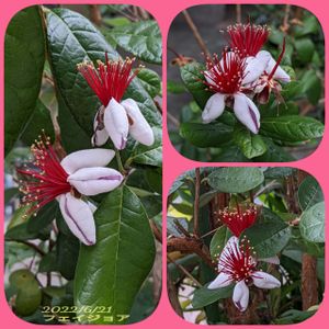 🌳木の花たち その264 フェイジョア 近所にも一本あるのですが、 何故かいつも花の開花のタイミングを逃してばかりで、 どこかで出会えたらと思っていたお花です。 この木は花付きが良くたくさん咲いていました。 どこにフォーカスしようか迷うほど。 この長いシベが綺麗です。 (*´ᴗ`*)🤍💗 ⛅️ *・゜゚・*:.。..。.:*・'💠'・💠* 💠✨:.。. .。.:*・゜゚・* ⌘ メモ ⌘ 🔸科名・属名 フトモモ科 フェイジョア属 🔸学名 Acca sellowiana 🔸英名 feijoa pineapple guava guavasteen 🔸原産地 ブラジル南部 パラグアイ ウルグアイ アルゼンチン北部 🔸花期 5月〜8月 🔸花色 外側 白 内側 紫色をおびる 🔸結実 10月〜12月 🔸特徴 常緑低木。広葉樹。樹高3~5m。よく分枝する。 1890年にフランス、1900年にアメリカに導入、 日本へは昭和初めに導入された。 葉は対生する単葉で、楕円形、全縁。革質で、 表面には光沢があり、裏面には綿毛が密にはえて 銀灰色。 花は葉腋に単生する径4cmほどの4弁花。肉厚。 紅色の多数の長い雄しべが目立つ。 果実は長さ3~10cmで卵形~楕円形の液果で、 白色を帯びた緑色。果実の先端には萼裂片が 王冠状に残る。果肉はクリーム色で、甘く、 パイナップルのような香り。 🔸用途 果実は、生食の他、ジャムやゼリーなど。 花弁も甘みがあり、食べられる。