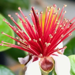 フェイジョア゚・✿︎・゚:✲︎: 長いシベが可愛いお花💕 今まであんまり咲かなかったけど今年は まぁまぁの開花♬ 実が成ると良いなぁ゚*.。.*゚*.。.*゚✨