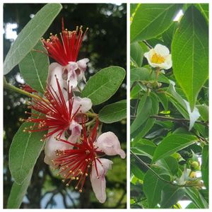 今日の庭 ☁️ 左 フェイジョアの花 次々咲いていますが 今年は反り返るような 開きかたしてる💧 右 ヒメシャラ ひとつ咲いているの 見つけました🌼