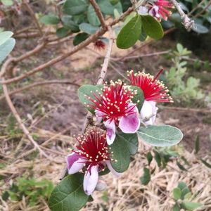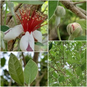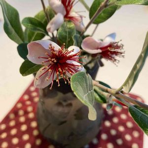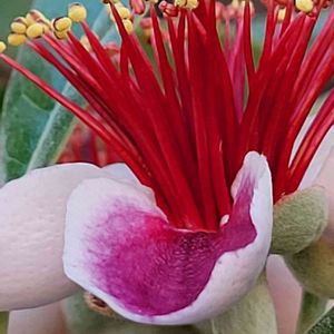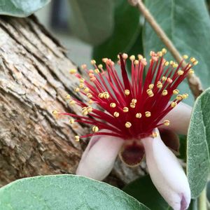 フェイジョアのお花が綺麗に咲いてました🌸 息子の玄関先にて 調べました。 フェイジョアは、高さ5~6mになるフトモモ科の常緑小高木で、庭木や生垣にも用いられます。葉は長さ5~7cmの卵形の楕円形で革のような光沢があります。葉の裏面には綿毛が密に生えて銀白色です。7月~8月に直径4cm程度の花が咲きます。分厚い花弁の外側は白い綿毛が生え、内側は薄紫色、鮮やかな赤いおしべが特徴的です。エディブルフラワーとして食べることもできます。フェイジョアの果実は卵状の楕円型で灰緑色。果肉はパイナップルのような香りがあり、生食やジャムにして食べられます。フェイジョアは別名をパイナップルグアバといい、日本には昭和初期にアメリカから渡来しました。暖地性の樹種ですが、寒さにも強く成木ではマイナス10度にも耐えられます。