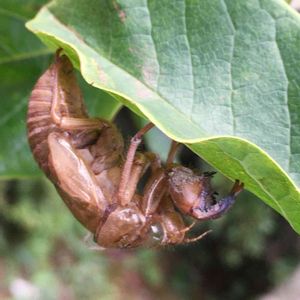 暑い… クーラーと扇風機のダブル使用💥 こんなんじゃ仕事してた方がいい… ゆずり葉の裏にお客様🌈 今ごろどこで鳴いてるのかな〜🎵