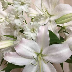 おはようございます✨ 今日の最高気温 36度だって😓 雨☔️降ってくれ〜💦 真っ白なお花で涼しげに╰(*´︶`*)╯♡ これが最後のユリと 2度目の開花のデルフィニウムです💕
