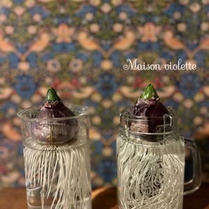 ヒヤシンス🪻水栽培 毎年、🪻を水栽培で育てています! 花ももちろん素晴らしいのですが、 球根から芽を出した、この時期 なんとも可愛らしいです💜 そして背景は、言わずと知れた ウィリアムモリスの いちご🍓泥棒