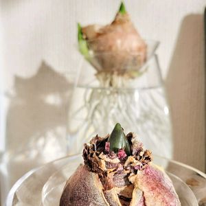 ヒヤシンス水栽培 その後。 手前 2年目の球根💜 思った以上に しっかりした芽が出てきて 期待が高まる 奥 今季買った球根🤍 なんと芽が3つ…と思いきや 写っていない側にも あと2つ… うーん… エネルギーが分散されてしまうかな… 蕾がしっかり育つか… 観察はつづく🧐