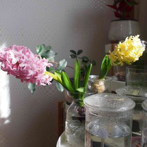HCからお迎えした ヒヤシンス 3個の球根から5個も花が咲きました‼️1本は切り花にしてキッチンに飾りました❤️