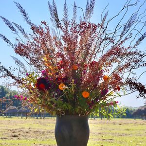 縄文土器をイメージした花器 秋の花材を使用した花生け🍁 青空に映えますね〜✨素敵でした🎉 🏷おしゃれな土曜日