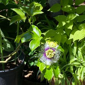 パッションフルーツに花が咲きました。 見た目は時計草です。 1〜2ヵ月後収穫できるかなぁ。