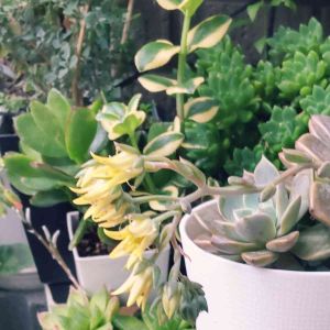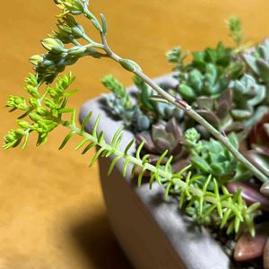 こんばんは〜 先月寄せ直した多肉さん達🍃 花芽と競争⁉️なぜか一本だけ伸び伸びのセダムさん 笑っちゃうくらい伸びてます 測ってみたら何と10センチ❣️ こんなまちまちな成長も楽しいです💕