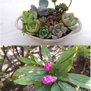 ㊤11月1日 深夜に小さな寄植えを作りました。真ん中のスペースにオーロラの葉っぱを3枚。上手く育つといいな😊 ㊦11月2日 街路樹のツツジ?サツキ?が咲いてました😯蕾をパシャリ📸 公園ではセミが鳴いていて、11月とは思えない日でした☻