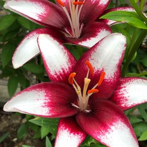 今日も暑かったですね🌞🌞🌞 我が家で2番目に咲いたユリは「カフェノワール」 実は、昨日投稿した「シュガーラブ」と共に秋に植えそびれて袋の中でホワイトアスパラガスに根が生えたような姿になっていたんですが、ダメ元で春になってから植えたところ植えっぱなしのユリより早く咲きました🤭 以前投稿したチューリップといい、今回のユリといい、植えそびれてもちゃんと咲くんですね 春咲き球根はすでに花芽が球根の中に出来ているというのを証明したような今年のお花たちでした