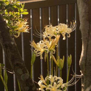 只今帰りました なにか袋を被ってるみたいな蕾を見かけたので 先程覗いてみましたら クリーム色の曼珠沙華が咲いているのでした いよいよ秋ですね