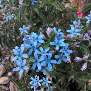 オキシペラタム(ブルースター) 花は3㌢程で咲き始めは水色、咲き終わりに近づくにつれ青が濃くなり紫色に近い色になります。 2020(令和2年)12/18撮影 すみません。『忘れな草』」にも似てます。間違えているかもわかりません。