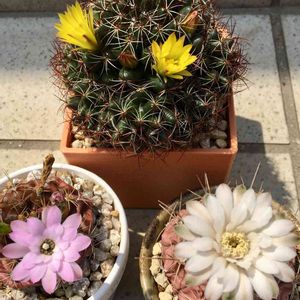 naoさんに、サボテンは焦らし上手ですよね〜って書いているのがバレたのか、3種同時に咲いていました!しかも3色😻