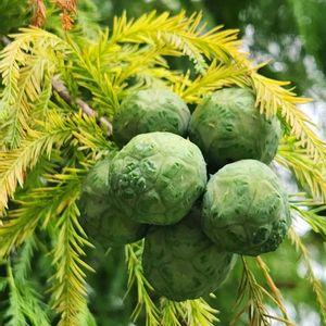 ラクウショウ(落羽松) ①抹茶を振りかけているような実 この実には油分がいっぱい 落ちているのを拾って持ち帰っても開き過ぎてリースには不向き。 ②もう紅葉が? たくさんの実が落ちる頃、公園の清掃担当はたいへんそうです。