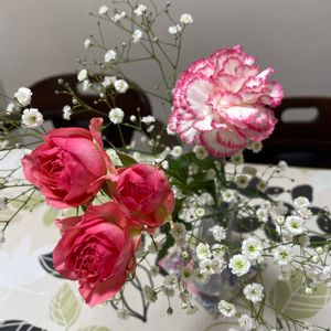 昨日スーパーで買ってきた 切り花セット🌸🤍💗 何とも綺麗なピンク色の薔薇🌹 小さなお花いっぱいの かすみ草🤍 そして縁取りの淡いピンクが可愛いかったカーネーションを食卓に飾りました😃 今日 1/9 🤳