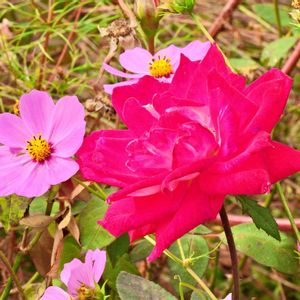 バラ(薔薇)とコスモス(秋桜) それぞれ綺麗な花が寄り添うように咲いています😄