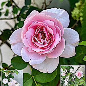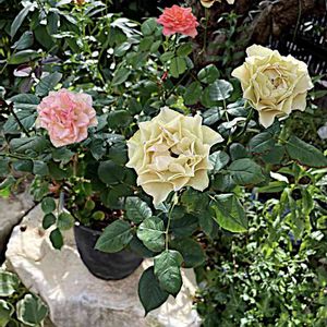 7月、文月。今年は早々に梅雨は去りしという。それは、例年以上に暑い熱い時期が長く続くということでもあるのだろう。 私の散歩道の道際等の草花達は、すでに、夏の強い陽を浴びて、多彩な色彩を作り出している--- 6月からの、熱い夏に向かって忙しい草花達---その22。 /ピンクのクリームイエローの花達、 白い庭石にのる鉢の中/ 少し間を置いての、近くの何時ものミニオープンガーデン。 そこには、昨年も出逢い観た、幾つかの馴染みの草花たちが、生き生きとして大きく深呼吸していた。 そのガーデンの入り口に、私を待っていたかの様にして、こちらを向いてピンク、クリームイエローの5つの花が、白い大きな庭石の上に置かれた鉢の中にあって、迎えてくれたのである。 バラ(薔薇)