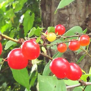 ツヤツヤで可愛いユスラウメの実 先っちょが尖ってます