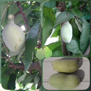 ポポー🍐 落果し始めました すでに3個落ちて 🐜🐛🐌虫さん達の物に🥲 ふたつは無事💚 薄緑色の皮から実のオレンジ色が透けて食べ頃🧡完熟サイン 独特の甘い香り ♪食べるなら落ちるまで待とう美味なもの 2025.9-27