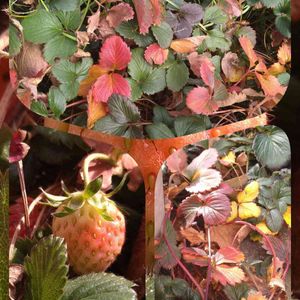いちご🍃☘🍓🥰🍓☘🍃 今年最初のいちごの日 プランター栽培から始まり 有り合わせの鉢で手作りイチゴポットへランナーを移植 3年目の冬越し ミニ花壇はいちごのランナー達で埋め尽くされ 手入れも出来ず手を余してしまった🫣😇🙃状態に…… 彩る葉を🤳🍃💛💚💕🌿撮りに出てみると ほんのり色づき始めた🍓 ひと粒発見😀💕