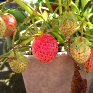 ランナーが野生化したプランター 🍓いちごが赤色になってきました 形からすると たぶん 🍓女峰🍓