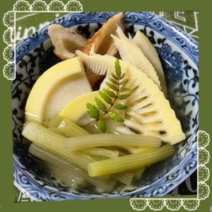頂いた孟宗竹筍と水蕗が最後になりました ちくわと一緒に炊き合わせ👩🍳 庭先の山椒の新葉を添えて🌃🍚🍜🥢