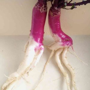 ミニ菜園だより〜👩🌾 わたしたち 土のお布団でのんびりしていたら 🧤引っ張られて 🚿綺麗にされちゃった もしかしたら 食べられちゃうの? 日野菜かぶ🤍💜🌿 睦月(むつき)…… お