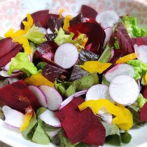購入した🛒 レタス💚 プリーツレタス🥬 紫小松菜💜(えぐ味はないので) ミニミニ菜園👩🌾 日野菜かぶ🤍 黄色パプリカ🫑 ビーツ🍠 🥗フレッシュサラダ👩🍳になりました 如月(きさらぎ)…… は
