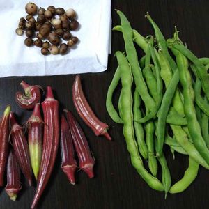 菜園だより〰👩🌾💦 台風🌀🌪️が来る前に 収穫✂突撃!! エプロンのポケットいっぱいに 詰め込んだのは 紅オクラ🔺🔻と ケンタッキーインゲン豆🟢💚 そして ひと握りの山芋のムカゴ🟤🤎 蚊取り線香を忘れて 腕や足には 🦟蚊に刺され 別のむかごがいっぱい😱☠️ ちょっとのつもりで 行ったのが 🙅OUT⚠ 明日…… 嵐が去るのと 痒みが去るのを じっと待ちましょうか……