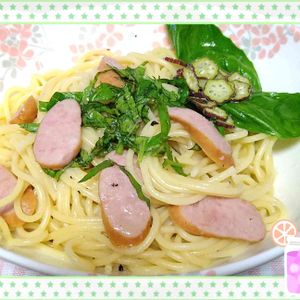ランチは…… 手抜きの🍃バジルぺぺロンチーノ🍝 紅オクラを添えて👩🍳 ミニミニ菜園のバジルは ちょっとしたとき 色添え 味変 助かります🌱