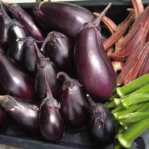 菜園だより〜👩🌾 収穫② 水茄子・ちび茄子(巨大化)🍆💜 (手前の小さなサイズがお店で売られてるサイズ🤣) 紅オクラ❤️・丸莢オクラ💚