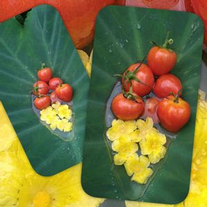 菜園だより〜🌱 こんな日にも 🥰でお遊び たくさん 実る ストロベリートマト🍅 花は咲くけど 全然実らない ホワイトゴーヤ🥒🏵 里芋の葉の雨水に浮かべて 花実手水??っぽく (´∀`*)ウフフ これ以上 🍅🏵乗せると 葉が倒れてしまいそう🤭