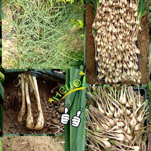 菜園端っこだより〜🌿 本格的な 長梅雨☔が来る前に…… お店で らっきょうが売られていたので 10/6に 60cm×180cm の 端っこスペースで 初めてのチャレンジし 放置していた(左上) そろそろ我が家のも大丈夫かな…と マルチの下にスコップを入れて 覗いて見たら 立派に育ってる\(^o^)/ 掘り起こし開始 マルチを少しずつ まくりながら らっきょう下の土にスコップ入れ マルチの上穴から 葉を持ってふりふり 土を落とし引き抜き 美容師さんの気分で 💇髪の毛切るように ✂ハサミで根を切りました (左下) モサモサ〰てんこ盛り 次に葉🌿も切り落とし あ〜 スッキリ 大小さまざま 486個の 新らっきょうが採れました🤍🤎🤍 みどりのまとめにも追記しました 良かったら…見てくださいね🌱