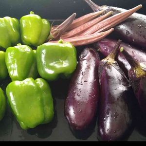 菜園だより〜🌿 テュル・テュ・テュル・テュ〜 ✂収穫time 🍆🔺🫑🥗🔪 🌃メニューは…… 日照不足で 紅オクラの色が薄い