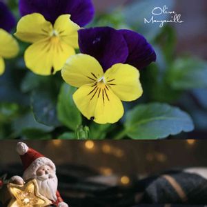 (✿╹◡╹)おはようございます! 🐶の散歩道にて🚶♀️ パンジーかな❓ ビオラかな❓ 🏷クリスマス月間ということで、クリスマスっぽい写真とコラボしておりますが、お花とサンタが見つめ合うような写真になりました ( ᴗ͈ˬᴗ͈)⁾⁾🙄