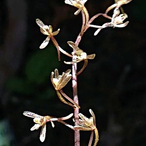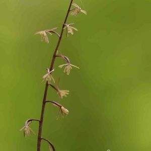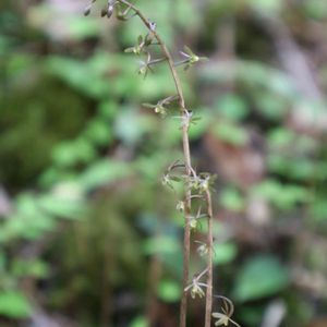 とても小さいラン科の花です♪ ヒトツボクロ(一黒子) ラン科 ヒトツボクロ属 多年草 本州、四国、九州に分布。 林内に生育。 高さ20〜30cm。 葉は1枚、卵形〜卵状楕円形〜狭披針形。 上面は暗緑色、下面は紫色で葉縁に波状鋸歯がある。 秋に新葉を1枚展開し越冬するが、花後の夏に枯れる。 花は総状花序に5〜10個、下向きにまばらにつける。紫褐色を帯びた淡黄緑色で、直径5〜7㎜。 萼片、側花弁は狭倒披針形、ずい柱は約3㎜。唇弁は倒卵形、約3㎜、3裂し、中裂片は広線形、縁は全縁、先は円形、紫褐色の斑紋がある。 側裂片は小さく、縁に細かな歯牙がある。 距は淡紅紫色で垂れ下がる。 花期5〜6月 6月9日撮影 福島県 南部