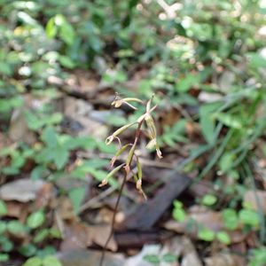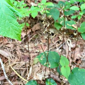 ヒトツボクロ 「今年は、ひょんなところから、 ヒトツボクロが2本出てきてね。 去年までは、なかったのに、 不思議だねー」 と、観察員らしき方が教えてくださいました。 「え?どこにいるんですか?」 と、私。 「ヒトツボクロは、見たことある? 根もとに葉が1枚あって、その葉の裏側が濃い紫色なんだよ。」 昨年も、探した憧れのお花。 それからの私の心はドキドキワクワク。その場所に向かいました。 いました。ロープの中。 遠くて、お花も葉の裏側も、よく観察出来なかったけれど、逢えただけで、幸せ。 花は、子房がふくらんで、もう終わり頃でした。 次は、近くに寄って、観察できるヒトツボクロに逢いたいな。 6.5 高尾山