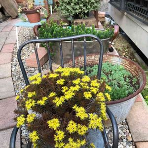 仕事先で もう大丈夫なの〜 大変でしたね〜 仕事してもいいの〜 無理しないでね もっと休んでいればいいのに ボチボチやんなよ 皆んなに労わって貰ってます🤗 セダム チョコレートボールに花が咲いてます🌼