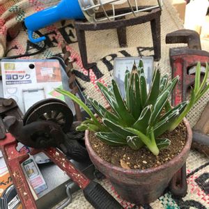🛠木工市の戦利品第3弾🛠 シャベリーナの私は 古道具屋さんでお買い物 コレ安いね〜 コレもいいね〜 わーコレ探してたんだ〜 コレッテまだ使えるの〜 👴🏻油さしてあげるよ これってまだ新品じゃん 👴🏻こんなのも有るよ いいねいいねそれも〜 全部でいくら〜💰 👵大きな電卓でいくらだよ え〜マケテヨ〜 👵😱 👴🏻たくさん買ってくれたから負けてあげるよ ヤッホー😙 ぴったりのお金渡して💰 お釣りは良いからね〜 👵釣り、、爆笑して私の顔二度見👀 今度は骨董屋さんへ 品定めしてると 🧔それは負けれないよ 私を知ってるので、けん制球 じゃあコレオマケに付けて 🧔アンタにゃ負けるわ😅 こんな楽しい買い物が出来る 木工市遊びに来てネ 今度は私も出店しますヨ🤗 錆び鉢にアガベ笹の雪🌵