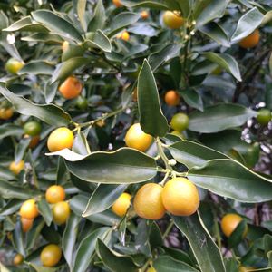 金柑(キンカン) ミカン科キンカン属の常緑低木。中国原産との説があるが、マレー半島からインドシナ地域が原産地で、古くに中国南部に伝わり、日本には1826年(江戸時代末期)に渡来したといわれる。中国の船が日本近海で難破し、静岡県の清水港に寄港した折、船員からもたらされた種が撒かれたことから日本での栽培が始まったといわれる。花期は6〜8月。葉腋に白い花を1〜3個つける。花弁と萼片はそれぞれ5枚。刺は短いが鋭い。果実は冬に黄色く熟す。着色すると美しいので、盆栽仕立てにして鑑賞用にもなる。 キンカンは他の柑橘類と違って外皮を食べる。皮の部分に独特の甘みとわずかな苦味があるのが特徴。古くから咳止めなどの民間薬として親しまれてきた。生食のほか、砂糖漬けやマーマレードにも利用される。風邪をひいたときはキンカン酒を飲んで休むとよいといわれる。キンカンには波寧(ニンポウ)、長実(ナガミ)、丸実(マルミ)などの品種があり、波寧は日本で一番多く栽培される。果実が大きめで甘いのが特徴で、中でも宮崎県の地域ブランド『たまたま』は、皮が柔らかいので生のまま皮ごと丸かじりできる。その他、近年は種なし金柑の育成が進み、『ぷちまる』『宮崎夢丸』なとが誕生した。 名前は、果実が鮮やかな金色に見える柑橘類であることに由来する。他の説として、キンカンは中国語では『金橘』と書き、日本人は『きんきつ』と読んだ。橘は日本の野生のミカンであることから、『金橘とミカン』からキンカンになった。また、キンカンは『○ん○ん』と『ん(運)』が2つつくので運がつく縁起の良い果物とされる。つるつるとした丸い果実から、日本人は江戸時代より禿頭をキンカン、キンカン頭などと呼ぶ。 出典『フルーツひとつばなし』『食材図典』『図説 果物の大図鑑』『樹木の名前』
