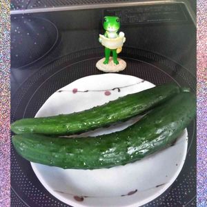発表します🎶 今日の収穫です 朝摘み。初きゅうり🥒 カエルさんが発表してくれましました💕