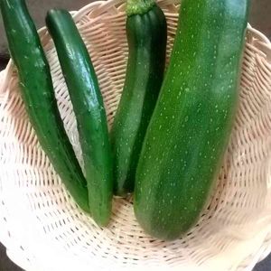 手作りのかごの中に、今朝収穫したズッキーニときゅうりをいれてパチ👀📷️✨ととりました❗アッと言う間に大きくなってビックリ👀‼️でした!やく30センチありました!